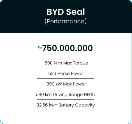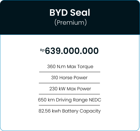 BYD SEAL embodies the spirit of innovation and power in a sleek, aerodynamic design. Built on BYD’s advanced e-Platform 3.0, it delivers exceptional acceleration, intelligent handling, and uncompromising safety. With its seamless blend of technology, elegance, and performance, the BYD SEAL sets a new benchmark for the modern electric sports sedan.