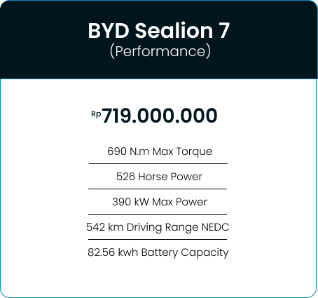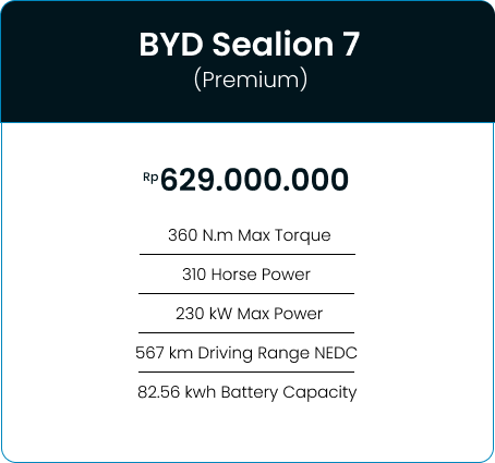 BYD SEALION 7 delivers power, elegance, and intelligence in one dynamic package. With its aerodynamic design, advanced e-Platform 3.0, and ultra-safe Blade Battery, it offers an exhilarating yet refined driving experience. Discover the perfect fusion of innovation and confidence — only with BYD SEALION 7.